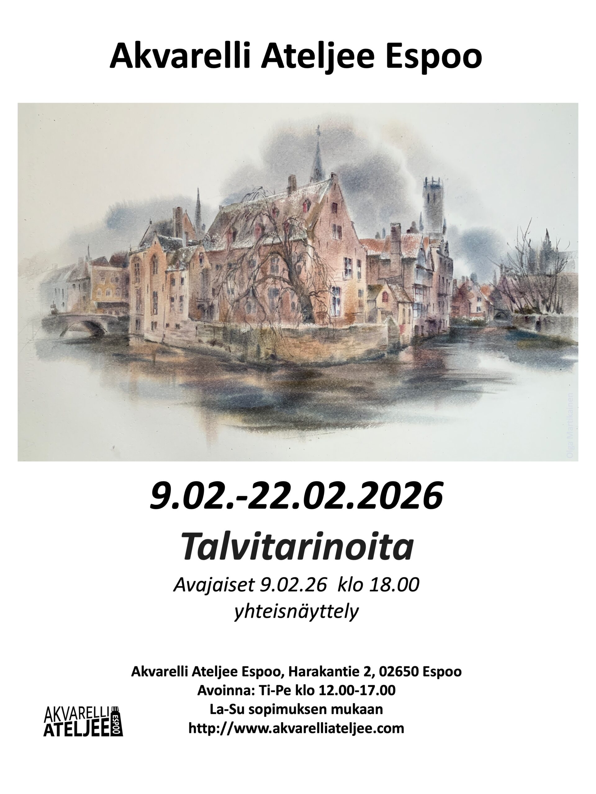 Avajaiset 20.1. klo 18.00. Akvarelli Ateljee Espoo, Harakantie 2 (Pohjois-Leppävaara) Avoinna ti-Pe klo 12-17, La-Su sopimukseen mukaan